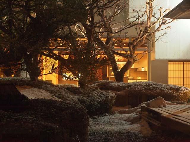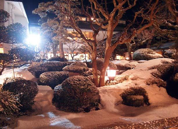 温泉からあがると辺りもすっかり暗くなり、ロビー前面に広がる「日本庭園」も雪あかりと館内の照明で浮き立って見えます。