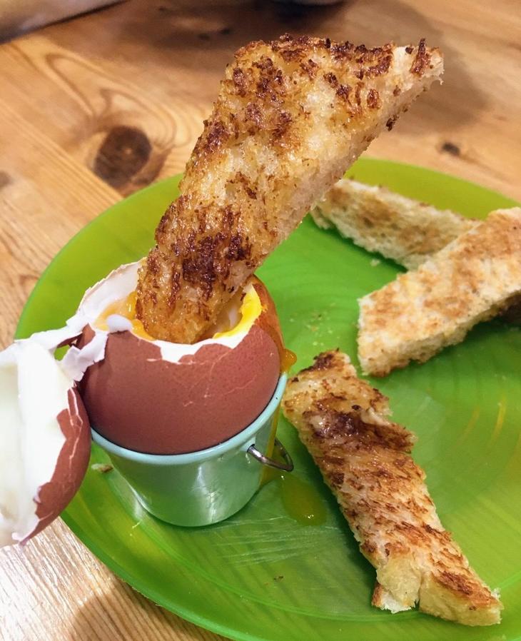さすがはレトロなクラシック感を再現しているお店。イギリス人にとっては「子供の頃に食べた懐かしいもの」の典型、と話にだけ聞いたことのある「卵と兵隊さん(こちらのお店ではdippy egg with soldiers)」をメニューに見つけました。早速子供にはそれを注文してみると、日本の純喫茶のようにバターがたっぷり染み込んだトーストが、噂通り細長くカットされ(普通は長方形ですが、食べやすいように先がすぼまった三角形に工夫されていました)、エッグスタンド代わりにした小さなバケツにのった茹で卵を開けると……