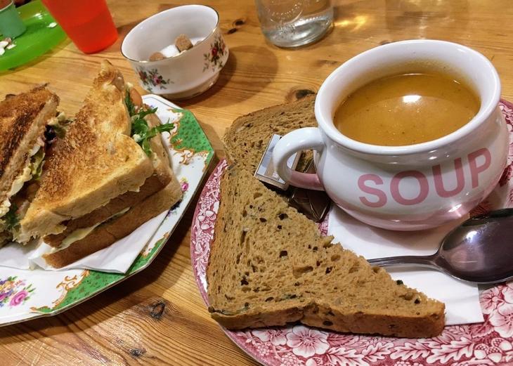 各テーブルには角砂糖の小皿と、すべて絵柄が違うお店ご自慢のヴィンテージティーカップとソーサーがセットされています。そのなかで、半個室のように独立している角席に腰を下ろし、クラブサンドイッチ £6.99(約1050円)と本日のスープ(この日は人参とパクチーのスープでした)£3.99(約600円)を頼みました。
