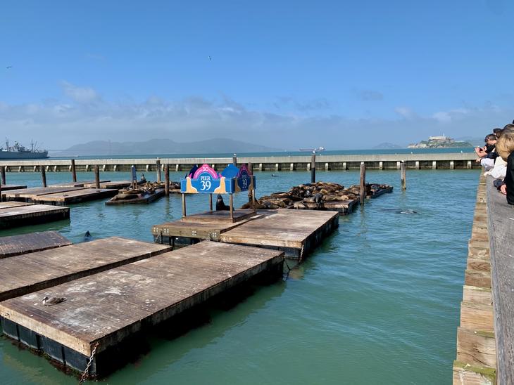 1989年サンフランシスコ地震のあと、ぴょこっと一頭のアシカが現れそれがいつの間にかKドッグ(K-2)を占拠しちゃってから今年は2020年で、30周年記念。エントランスプラザのオブジェもアシカに変わっています!ここはもっともサンフランシスコらしい観光地なのですが閑散としてます。商工会の方も新型コロナウイルスの影響で売り上げ50〜70%落ち込んでいるといってました。