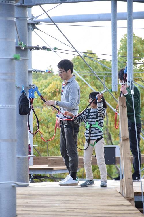 それぞれのアスレチックの金具をつけ替えるところに色のブロックがついており、青が簡単、赤が普通、黒が難しいとなっています。大人の男性でも失敗してスタッフのレスキューが出動していましたので、黒は難易度が相当高めです。