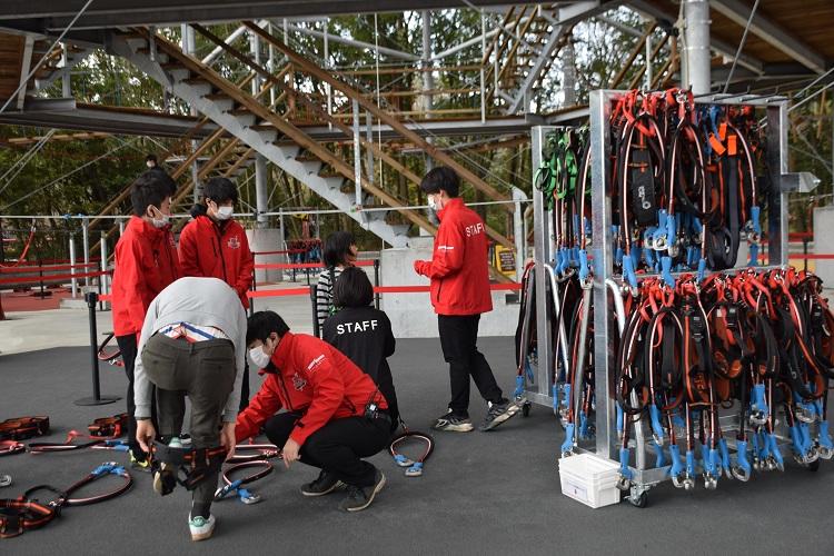 4番目は集合です。中に入ると、ハーネスをスタッフから装着してもらいます。リストバンドをつけてもらうのですが、入場時間ごとに色が異なっており、10分おきに約20人の入場となっています。入口はレッドエリアとブラックエリアのふたつあり、20人を半分ずつにわけてスタートです。4階まで自分の好きなアスレチックを選んで移動していきます。