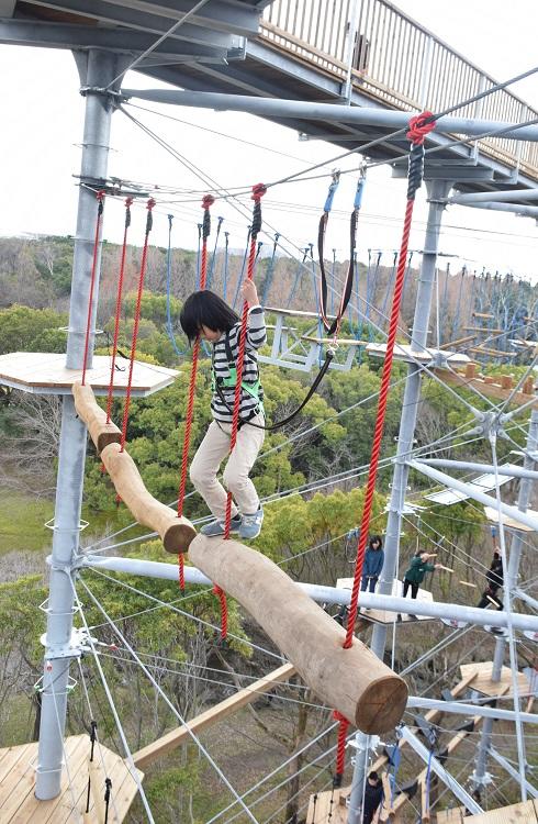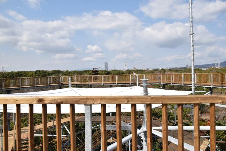 こんにちは。大阪特派員のかおりです。2020年3月15日、吹田市にある万博記念公園に万博BEAST(ビースト)というアスレチック施設がオープンするということで、初日にいちばん乗りで行ってきました。万博記念公園は開園しています。ドイツ発、六角形で24m、120種類が楽しめるアスレチックタワーです。全世界で100棟ほどあり、国内では静岡県のさがみ湖リゾートプレジャーフォレスト、滋賀県のブルーメの丘に次ぐ3番目で、世界最大です。計画から2年半、ドイツから本場の職人に来てもらい、建築に3か月かかったそうです。スタッフの方はレスキューの訓練を受けており、各階にひとりずつ配置し、初日は全スタッフ約30名がスタンバイしていました。初日にもかかわらず、スタッフの十分な数としっかりした教育で、混乱することもなくスムーズに進みました。場所は公園の西大路近く、わくわく池の冒険ひろばの横なので、西口から入場するのがいちばん近いです。