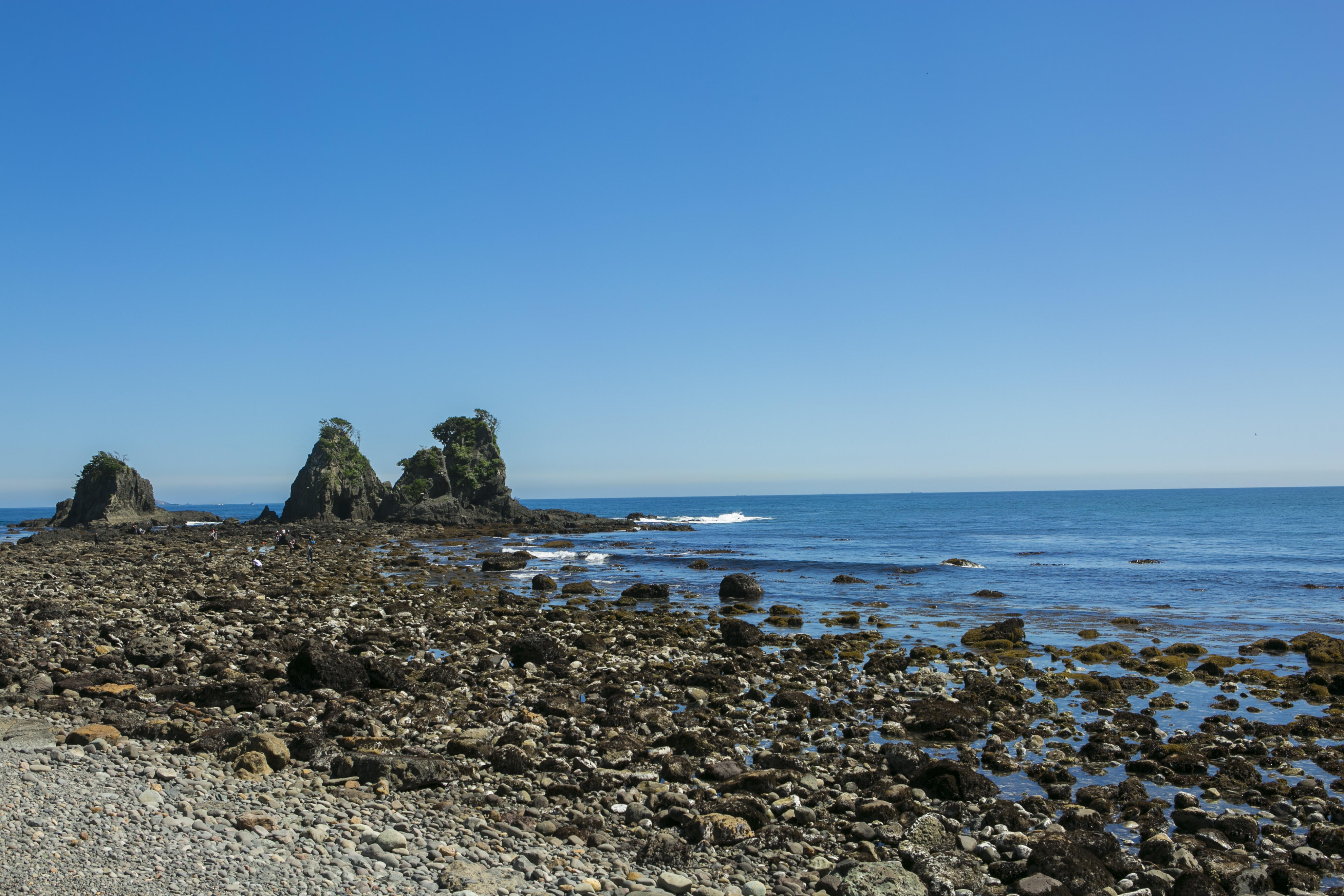 砂浜の弓ケ浜に対し、逢ヶ浜はゴロタ石が転がる磯の浜。