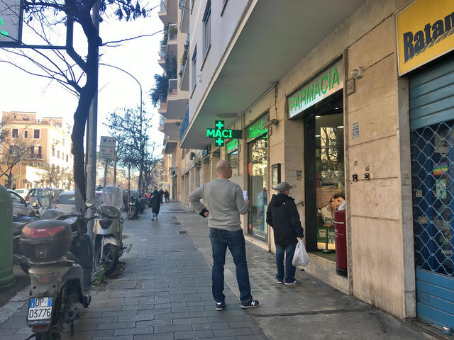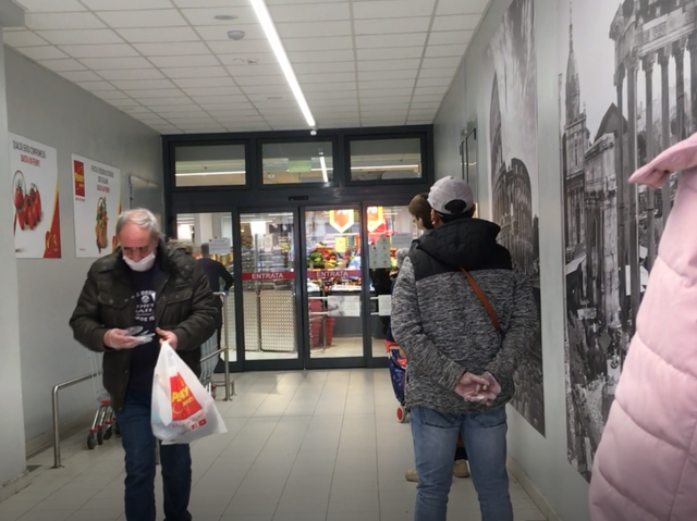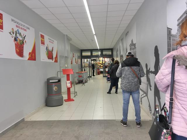 ↑ いよいよ入店が迫ってきました。このお店から買い物をして出てきた左の方のように、最近のイタリアでは、感染予防にマスク以外に手袋(ビニールやゴム製)をしている人も散見されます。イタリアには、もともと風邪や花粉症などでもマスクをする習慣はありませんが、ここ数日は町を歩くと半数くらいの人がマスクをつけています。マスクが品薄状態なので、マスクが手に入れられなかった方などは、マフラーで顔を覆っているのを目にします。