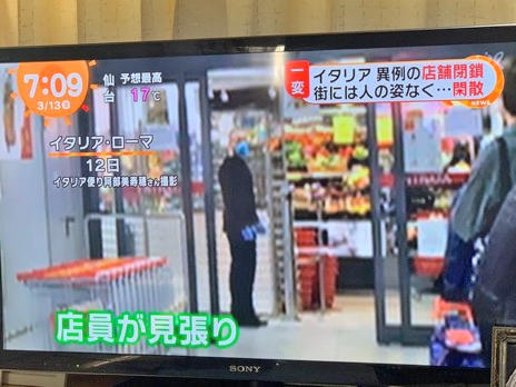 ↑ めざましテレビさんにお貸しした画像ですが、この中央に見えるマスクの男性のように、スーパーなどの入口では、店員さんが厳重に入場制限をしています。例えばこのお店では、広い店内に最大で45名までしか入れないように入場制限をしているそうです。規定では、この人数には店員も含まれるため、実際にはお客さんは38名で、1名お店から出たら1名入れるというように、厳しく入場人数の管理をしなければいけないとのことでした。イタリア全土で爆発的に感染者が増えているなか、店員さんも命がけで行っています。