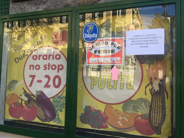↑ こちらは八百屋さんに出ていた張り紙です。ピンク色の矢印を入れた部分ですが、なんと3月15日から4月20日まで1ヶ月以上閉店です。このお店は、年末年始も、祝祭日の日も決して休んだことのない八百屋さんでした。おそらく3日以上休むのは初めてのことだと思います。新型コロナウイルスに感染することへの不安で、2月頃からお客さんも徐々に入らなくなっていたと思いますし、現在の状況を見通しての決断ならば仕方がなかったのかもしれません。イタリア全土で移動制限がかけられた3月10日から4月5日頃までは、「休暇をとります!」と書いて一時閉店してしまっているお店も多いです。