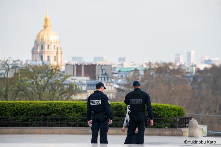エッフェル塔を望むビュースポットのひとつである、トロカデロ広場にあるシャイヨー宮のテラスも、いるのは公に許可された記者やカメラマンか、運動中の人。時折、YouTuberとおぼしき人が来るのですが、早々に警察に尋問されていました……。