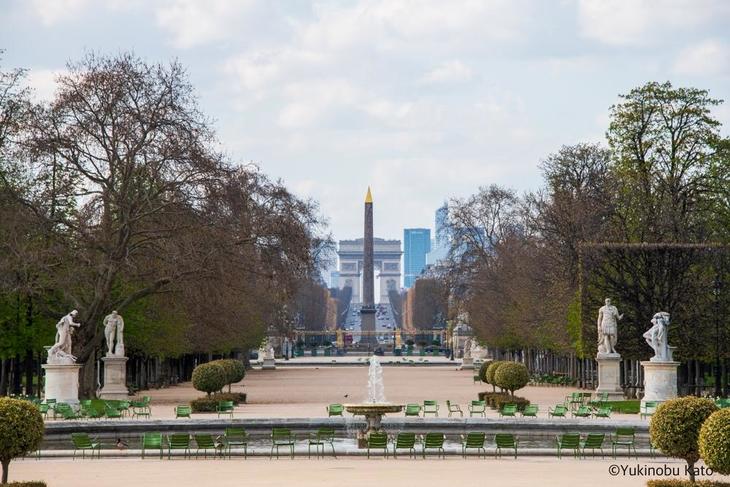 ルーブル美術館の西側にあるチュイルリー公園もこのとおり。パリ市の公園は3月16日から閉鎖されています。チュイルリー公園の先に見えるのは、コンコルド広場のオベリスクと、その向こうにシャンゼリゼ大通り、そして凱旋門です。