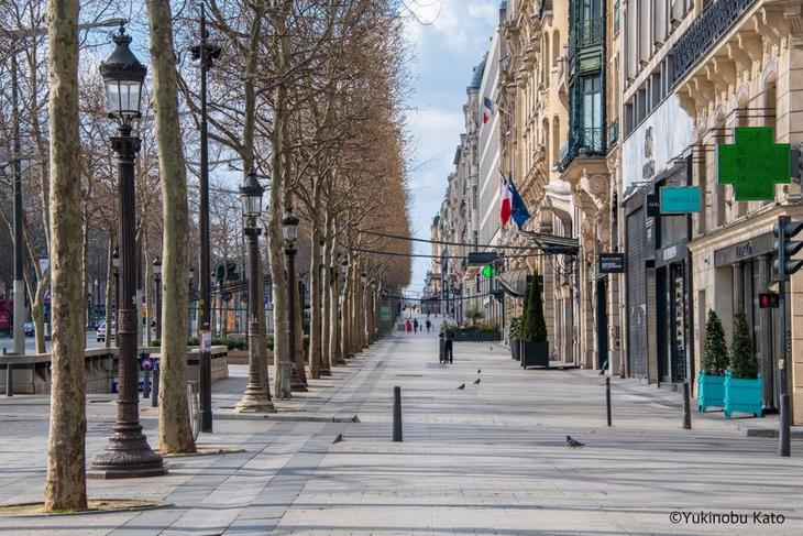 シャンゼリゼ大通りは、それでも道路にときどき車は通りますが、普段の様子と比べると想像できない静けさです。