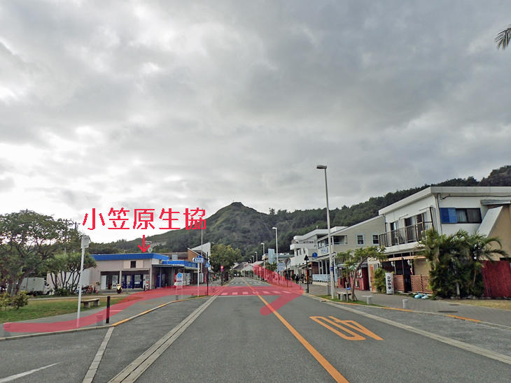 青い屋根の小笠原生協手前にある横断歩道を山側へ渡ります。
