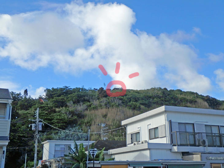 こちらは横断歩道手前から見上げた風景で、赤丸をつけたところがメイン展望台です。