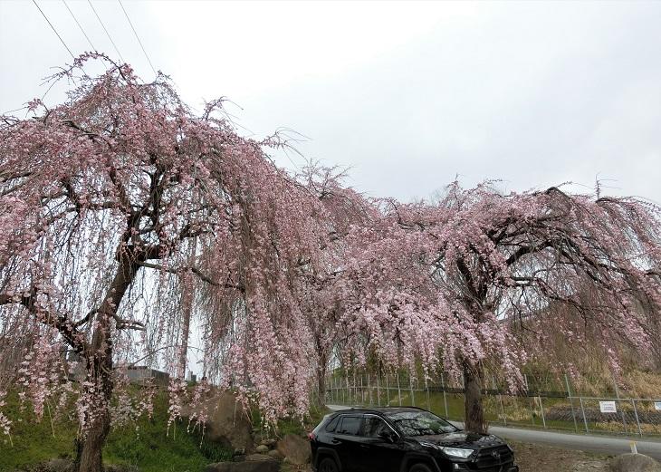 正解は「まみょうだ」です。大豆生田の信号すぐの場所にあるしだれ桜で、東京近郊よりは気温が低く桜の開花も少し遅れる北杜市のなかでもいちばんといっていいほど早く咲くのが特徴です。