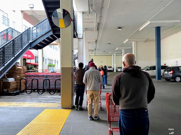 続いて、店舗に入る際の列も同じく日常の風景として馴染んでくるようになりました。スーパーなどの店舗の前では、6フィート間隔に線引きがされてあったり、人との距離を保ちながら並び、順番を待つのが買い物の習慣となりつつあります。