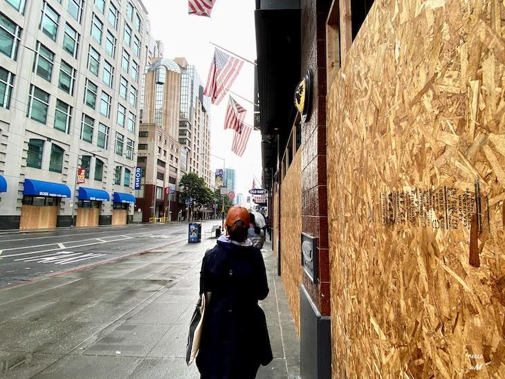 今週1週間で気づいたのは、数多くのホテルやリテール店舗が営業を中止し、防犯対策として通りのウィンドウにベニヤ板を貼りつけた様子が目立つようになってきたこと。