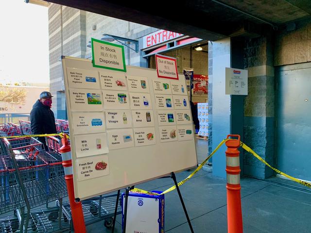 入り口から買い物客の導線に沿った、比較的広い通路に目一杯に並べてあり、スタッフが一つのカートに一つずつ渡してました(トイレットペーパーを背景に写真撮ってくれるサービスぶり^ ^V )3週間前は、一人2個までだったのが1個になってましたが、おそらくコスコの顧客は一通りトイレットペーパーは買ったのかこれに関しては買い方が落ち着いてきたと思います。サニタイザー・消毒関係は、欠品リストにあるように在庫なしで、"鶏肉が消えた"と噂されてますが、やはりありませんでした。"コスコチキン"と呼んでいる、売れ筋商品のローストチキンは健在、ロースターの中でくるくる回ってました朝10時の段階でも売れ行きはいいようでした。フレッシュのホールチキンを買うより安いコスコチキン($4.99)の不思議…