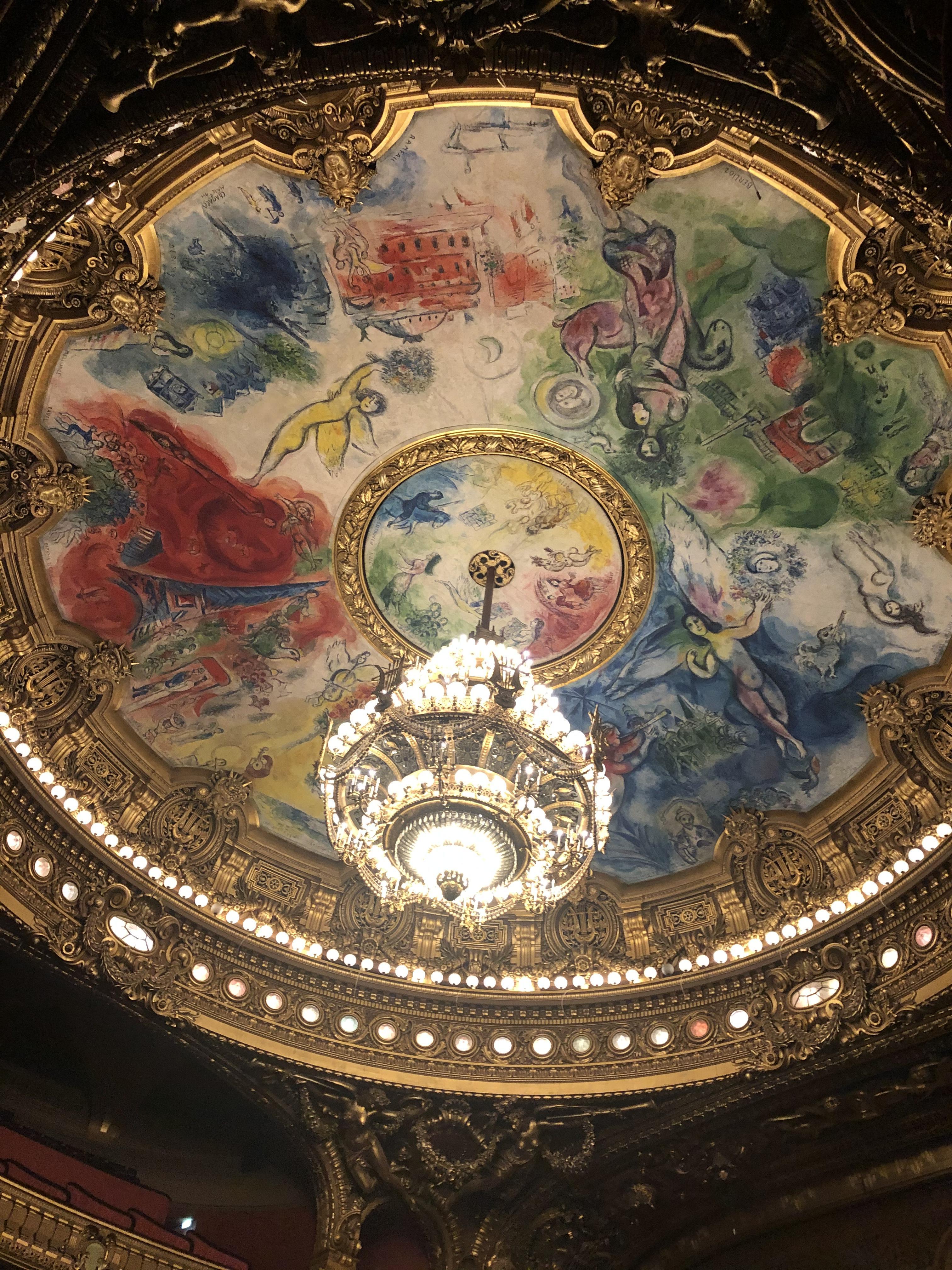 ▼オペラ・ガルニエのシャガールの天井画。最近では舞台装置の関係からクラシックバレエの演目はこちらではなく、オペラ・バスティーユで上演されます。