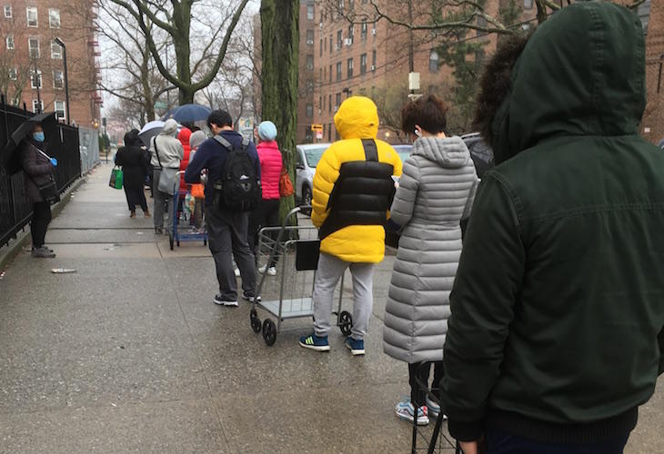 2020年3月29日 ニューヨーク、クイーンズ区のスーパーマーケットの入場制限に並ぶ列