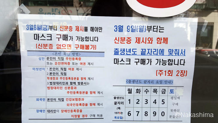 新型コロナウイルス感染症の拡大とともに、韓国でもマスクの購入が難しくなり、韓国では2020年3月9日からマスク需給安定化対策により、生まれ年の末尾の数字によって決められた曜日に、マスクが1週間で2枚購入できる「マスク5部制」が実施されています。