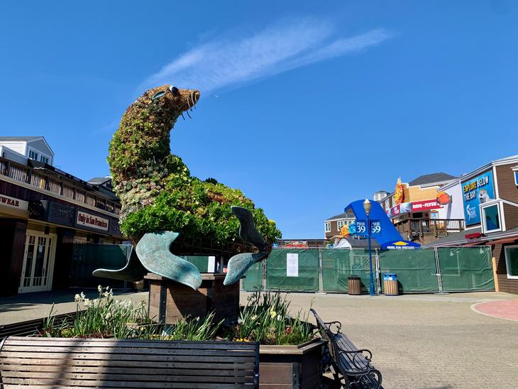2020年の今年は、ピア39のK-Dockにアシカ(Sea Lion)がやってきて30周年。いろんなところに、地元アーティスト作のアシカのオブジェが飾られ、記念行事もありました。ピア39のエントランス広場にある蟹のオブジェから、今年はアシカに代わったのに、大きなお目々が寂しそうです。