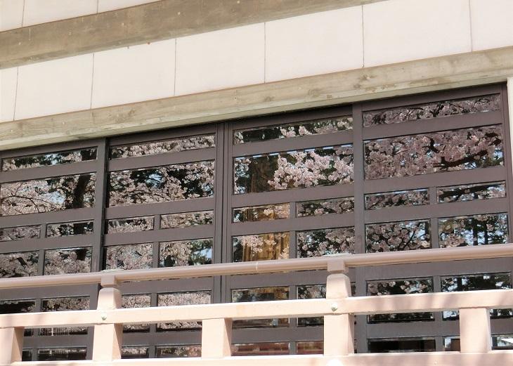 その桜が本殿のガラス窓に映りこんでいて、風情がありますね。