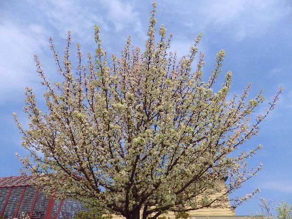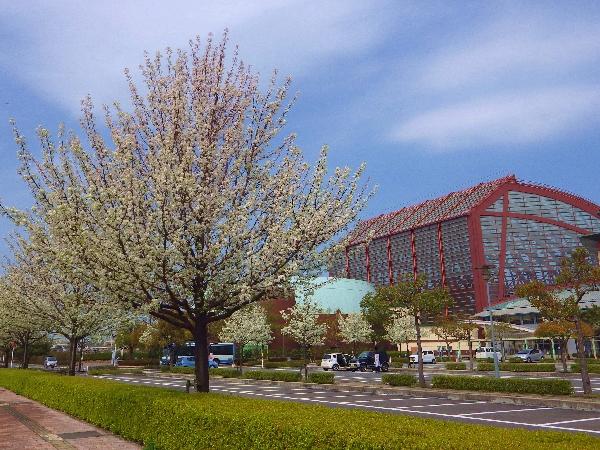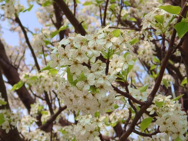 倉吉市(くらよしし)にある梨のテーマパーク「鳥取二十世紀梨記念館なしっこ館」の前を通ると、白い花と緑色の葉っぱが春らしい爽やかなコントラスのマメナシの花が満開でした。
