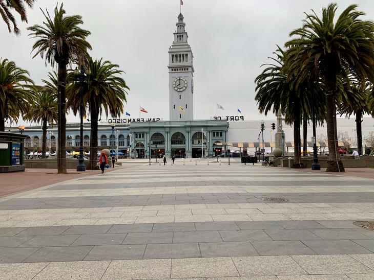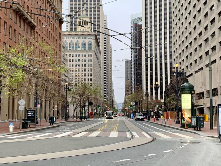 フェリープラザからマーケット通りを見ると…ミュニバス、ミュニメトロ代替えバス、警察車両、工事車両しか通っていない。恐ろしいロックダウンのサンフランシスコマーケット通りでした。
