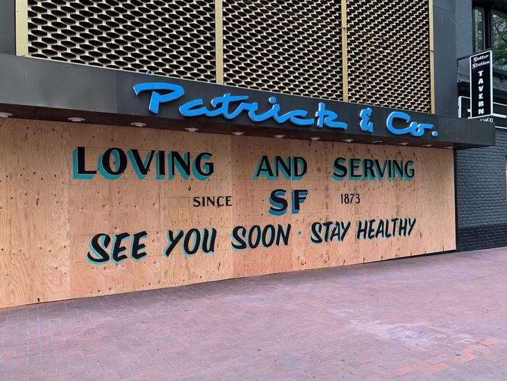 1873年創業、老舗のオフィスサプライストア『Patrick & Co』のバリケードには"Stay Healthy"