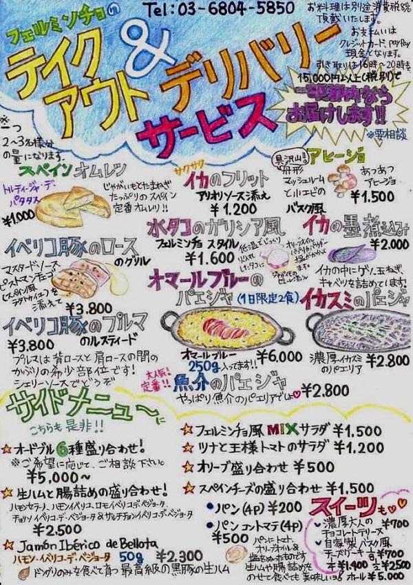 FERMiNTXOも新型コロナウイルスによる自粛を強いられるなか、テイクアウトサービスをスタートしました。ここに典子さんお手製のメニューを貼りますが、多少変わっていることもあるかと思うので、オーダー時にご確認ください。税別1万5000円以上の場合、場所によってはデリバリーも可能だそうです。