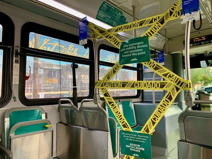 ウィズコロナ、ドライバーさんとの距離を保つために、公共交通機関(バス)は、車椅子以外、降車側のドアから乗り降りします。地域柄か頑丈にテープしてる。