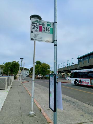 道路横断して直ぐにACトランジットのバスが見えたのでドライバーさんにエメリービル駅行きのバスを聞いた。時刻表を記念に撮影しておきましたので、もし利用する際の参考(マップはこちら)にしてください。結構本数出ていますね。