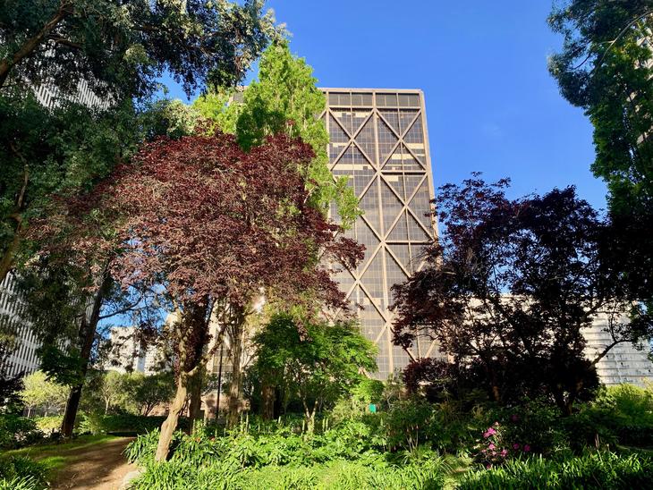 X印の外観がユニークなビルで、アメリカでもたいへん有名です。完成したのは1964年。建築関係の方なら誰でも知ってる都市計画・建築エンジニアリングのグローバルカンパニーの"スキッドモア・オウイングス&メリル(SOM:Skidmore,Owings&Merill)社"が手がげています。何といっても耐震用の筋かい(ブレース)のデザインが特徴です。"ブレース(Brace)"って、歯科矯正の用具と同じで何かを固定する装具を意味します。建物の対角線に補強材を差し込んで揺れたときの変形を防ぐ働きがあるそう。SOM社が、エックス(X)形の筋かいを"外観のデザイン"として初めてビルに取り入れました。そのあと、シカゴのジョン・ハンコック・センター(John Huncock Center/1969年完成)ができてるんですね。