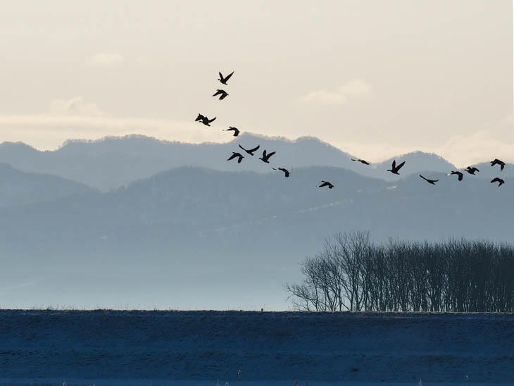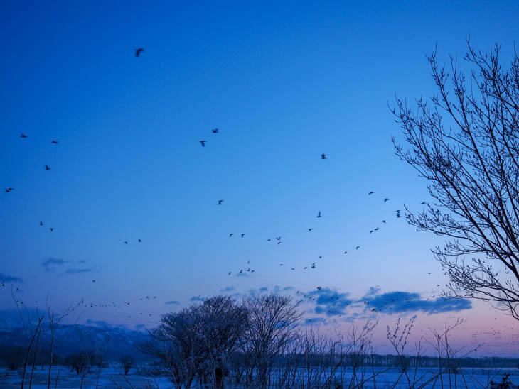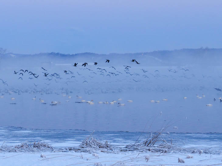 そのため、マガンが水辺から飛び立つねぐら立ちやねぐら入りする早朝や夕刻は、まだとても寒くなる季節でもあるのですが、ひとたび渡り鳥が優雅に空を飛ぶ光景を見れば、その寒さを忘れるほどです。