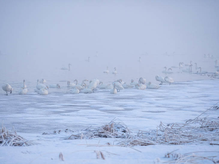 幻想的なコハクチョウのいる風景は、こちらも美唄市の「宮島沼」。