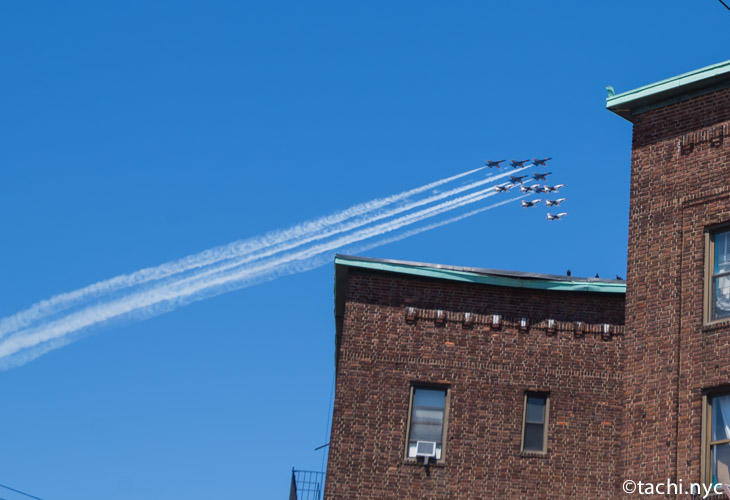 雨や曇りが続いていたのに、気持ちよく晴れた2020年4月28日。ランチタイム(昼12時〜)に、医療従事者の働きを讃え、空軍の「サンダーバーズ(Thunderbirds)」と海軍の「ブルーエンジェルス(Blue Angels)」の12機がニューヨーク市の上空を飛びました。