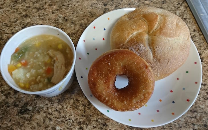 「THE SALVATION ARMY QUEENS TEMPLE CORP の前を通ったときに、いただいたランチ。スープはチキンやインゲンなど入って、おいしかったあ。ここは平日の午前10〜13時までやってます」