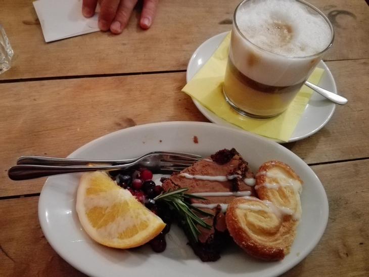 締めのデザートはスペインらしく、オレンジの風味がきいたブラウニーとパイ菓子「パルメラ」。