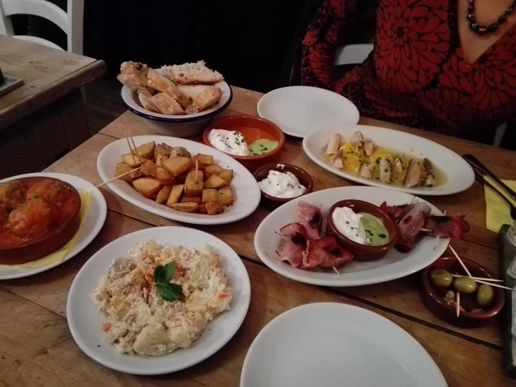 スペインの生ハム「ハモン・セラーノ」や、香ばしく揚げられたジャガイモ「パタタスブラバス」など、いろいろ運ばれてきました。タパスの醍醐味は、なんといっても数種類の品をオーダーして皆で楽しく分け合うこと。