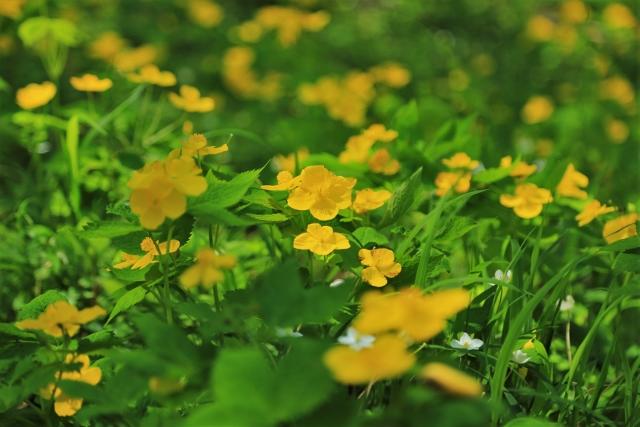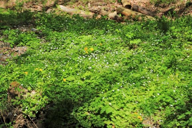 (ところどころに混じる黄色の花がヤマブキソウ)