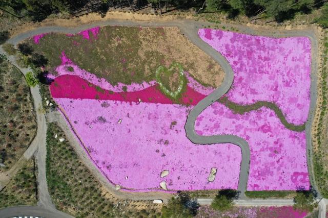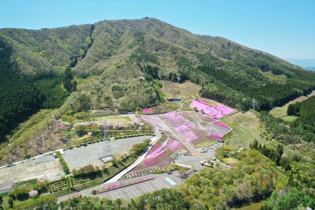 蓬田岳の山麓約2.3haの敷地に広がる一面の芝桜が訪れる者を魅了します。