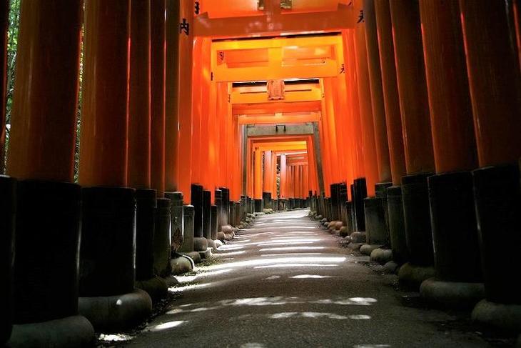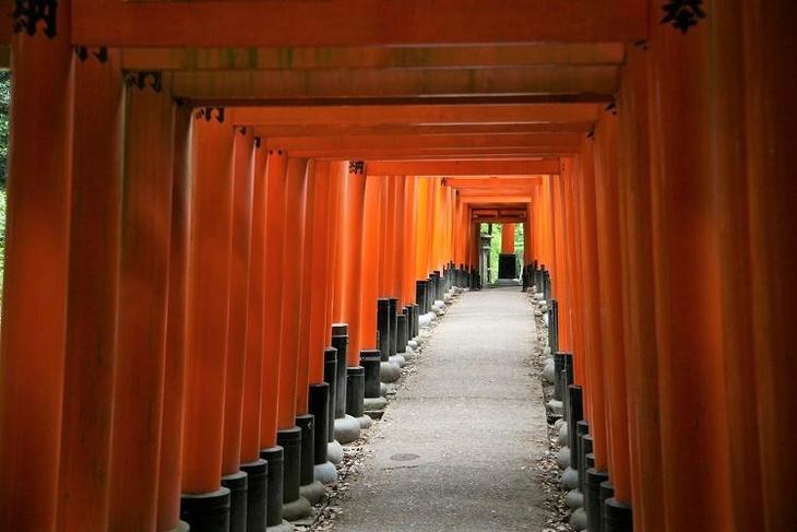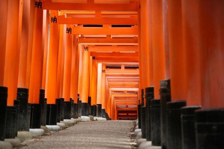 〇 赤い鳥居が続く、千本鳥居の景色が極めて日本的。