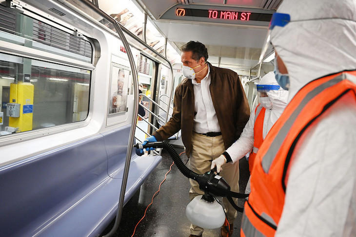 なんと、クオモNY州知事自ら、地下鉄の消毒を体験。記者会見は、クイーンズ区にある地下鉄7番線の車両基地で行われました。3月はクオモチームの距離もまだくっついていましたが、今やソーシャルディスタンスは厳守。もちろん、記者会見も入場制限の上、距離を保っています。