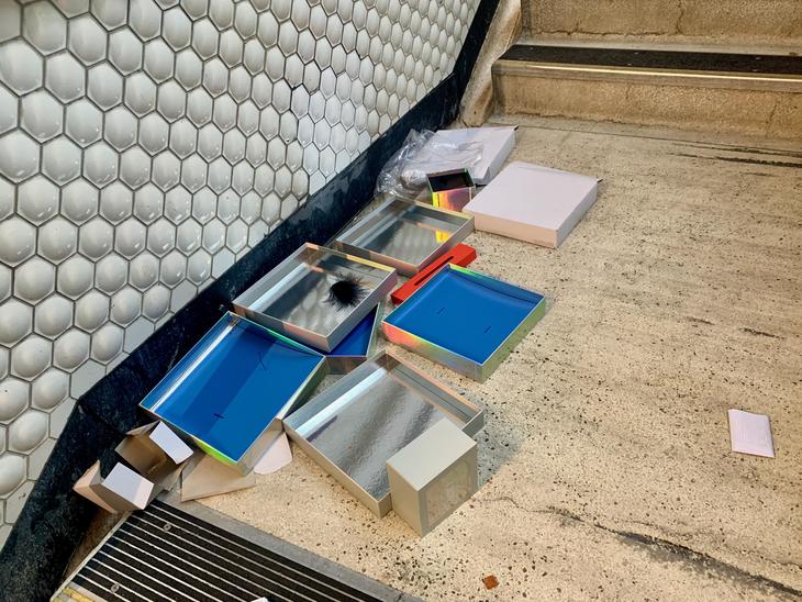 パウエル駅の階段にはスイスの時計ブランドの空箱散乱。前夜の略奪・暴動がいかなるものだったのか想像ができます。