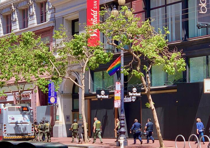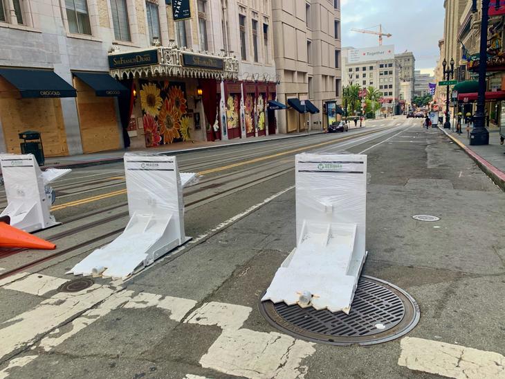 月曜日の朝、通勤途中に発見したのが、連邦ビル駐車場にあるものとほぼ同じ形のバリア。ユニオンスクエア方向にいく車線に設置されていました。そして数人の若者(全員白人)が手錠をかけられ歩道に座らされていて、恐る恐る通り過ぎバートの駅に向かいました。
