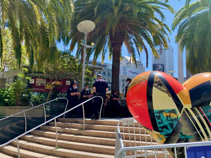 午後のティータイム?ウエストフィールドショッピングセンター前には、警察関係者のユニフォームと迷彩色のユニフォームの人達が入り混じって談笑しながら移動用の車両に乗り込んでいました。
