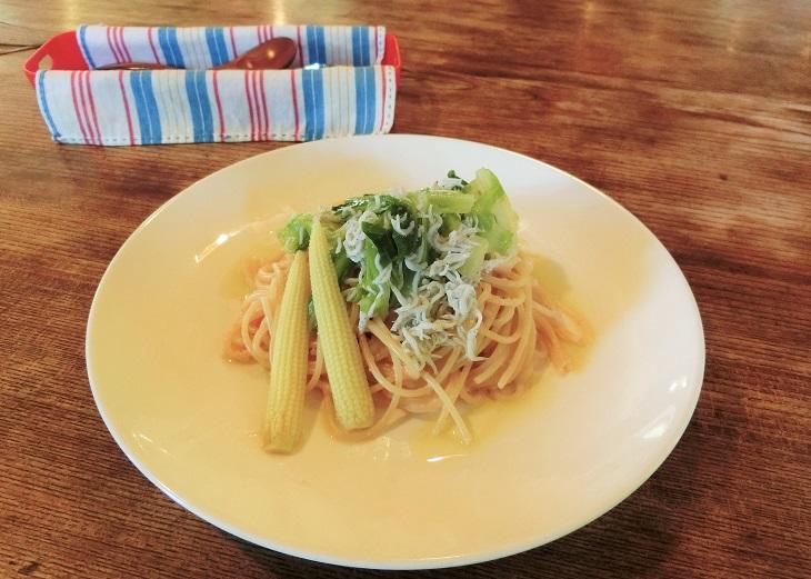 「明太子としらす、春キャベツのパスタ」です。明太子が思いのほかピリッと辛くて春キャベツはやわらかくしらすがさっぱりしていておいしかった! ほかにも地元のジビエを使った「鹿肉のラグーパスタ」や「湧水マスと蕗味噌のクリームパスタ」など魅力的なメニューが並んでいます。「カルボナーラ」や「海老のオムライス(セットで1300円)」もありますよ。