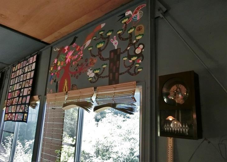 「このブラインド、変わっていますね」と訊くと、「大月で盛んな機織り機のパターンで作りました。ぶ厚い紙でけっこう丈夫なんですよ」とのこと。光の入り具合もやわらかでのどかな気持ちになりました。窓際にかけられた柱時計がまたいいんです。30分ごとにボーン、ボーンと低い音で時を知らせてくれて、ゆっくりゆったり時間が流れているのを感じ、さまざまなことごとに緊張していた心が解き放たれていくかのようでした。