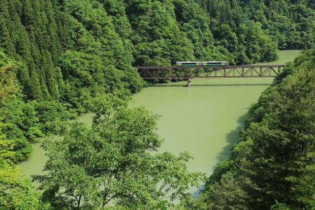 只見川をイメージした新車両(キハE120)は、往年のキハ40をうまく継承しています。