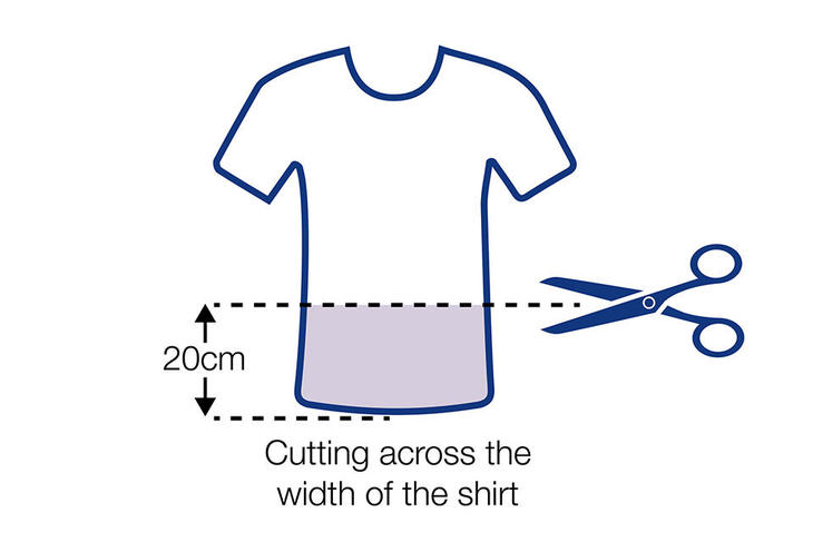 ▲ Tシャツの裾から、20cm上をハサミで平行にカット
