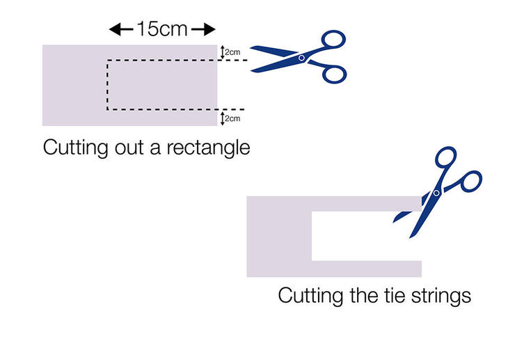 ▲ 片方の端から、長方形を切り取り(左上の図)、2本の紐の端を切る(右下の図)